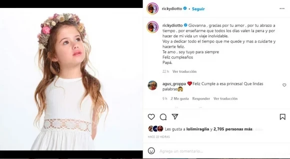 Sin quedarse atrás o como el villano de la historia, Ricky Diotto realizó lo propio en sus redes sociales, en donde publicó una foto de Giovanna y comentó: "Giovanna, gracias por tu amor, por tu abrazo a tiempo, por enseñarme que todos los días valen la pena y por hacer de mi vida un viaje inolvidable. Voy a dedicar todo el tiempo que me quede a cuidarte y hacerte feliz. Te amo, soy tuyo para siempre. Feliz cumpleaños".