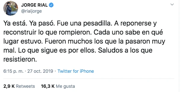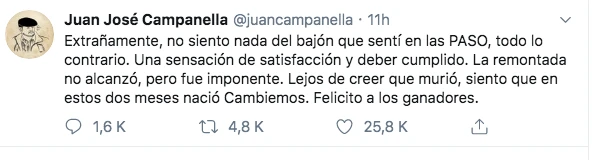 “Extrañamente, no siento nada del bajón que sentí en las PASO, todo lo contrario. Una sensación de satisfacción y deber cumplido. La remontada no alcanzó, pero fue imponente. Lejos de creer que murió, siento que en estos dos meses nació Cambiemos. Felicito a los ganadores”, expresÓ Campenella, quien es fiel seguidor de Juntos por el Cambio