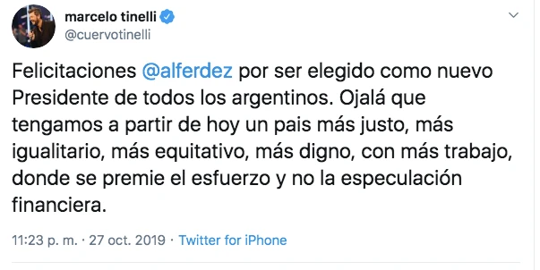“Felicitaciones @alferdez por ser elegido como nuevo Presidente de todos los argentinos. Ojalá que tengamos a partir de hoy un país más justo, más igualitario, más equitativo, más digno, con más trabajo, donde se premie el esfuerzo y no la especulación financiera”, escribió Marcelo Tinelli