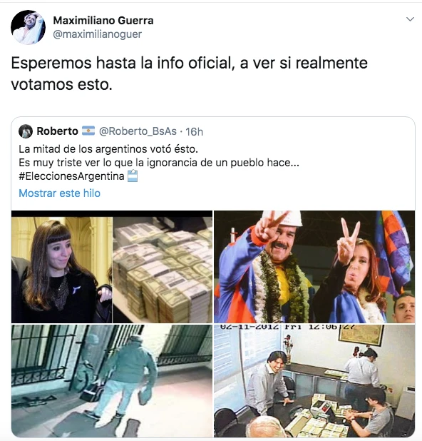 El triunfo del Frente para Todos trajo una ola de comentarios de felicidad, alivio, rabia y desilusión de los ciudadanos y quienes no duraron en manifestarse fueron los famosos en la red social Twitter, entre los más destacados, Marcelo Tinelli, Jorge Rial, Nancy Duplaa y Pablo Echarri, Mariano Iudica, Florencia Peña, Eduardo Feimann, Jorge Lanata, Maximiliano Guerra, Juan José Campanella y Luciana Salazar.