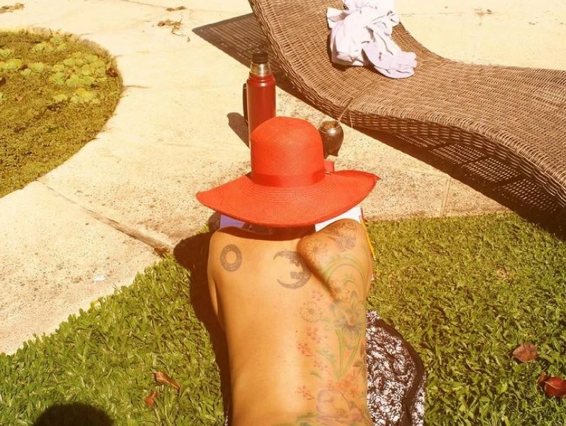 “Algunos veranos atrás… viviendo muchas vidas…”, escribió la actriz en su cuenta de Instagram para acompañar un posteo donde se la ve en un momento de ocio, de espaldas, adorando a Febo, luciendo todos sus tatuajes en su esplendor, tomando mate y dedicada a la lectura.