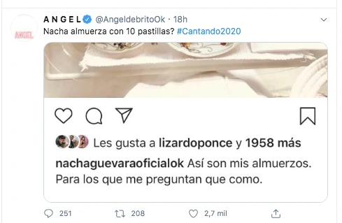 Instantáneamente publicó ese material en la plataforma digital, infinidad de internautas pusieron la lupa en las pastillas, unas diez en total. Incluso, el propio Ángel de Brito armó un tuit y se preguntó: “¿Nacha almuerza con diez pastillas?”.
