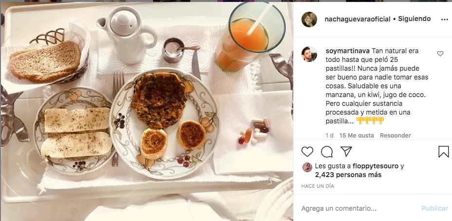 Los comentarios se direccionaron hacia ese debate, de tratar de dilucidar cuán natural podría ser una alimentación con tantos comprimidos. Así se repitieron mensajes como: “Tan natural era todo hasta que peló 25 pastillas. Nunca jamás puede ser bueno para nadie tomar esas cosas. Saludable es una manzana, un kiwi, jugo de coco. Pero cualquier sustancia procesada y metida en una pastilla, no”.
