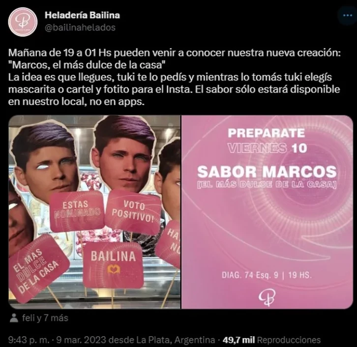 “Este viernes entra a Bailina: Marcos, el más dulce de la casa. Los esperamos a conocer este tremendo sabor nuevo con un evento lleno de sorpresas”, escribieron en sus redes sociales mostrando la imágen del helado e invitando a los fanáticos al estreno.