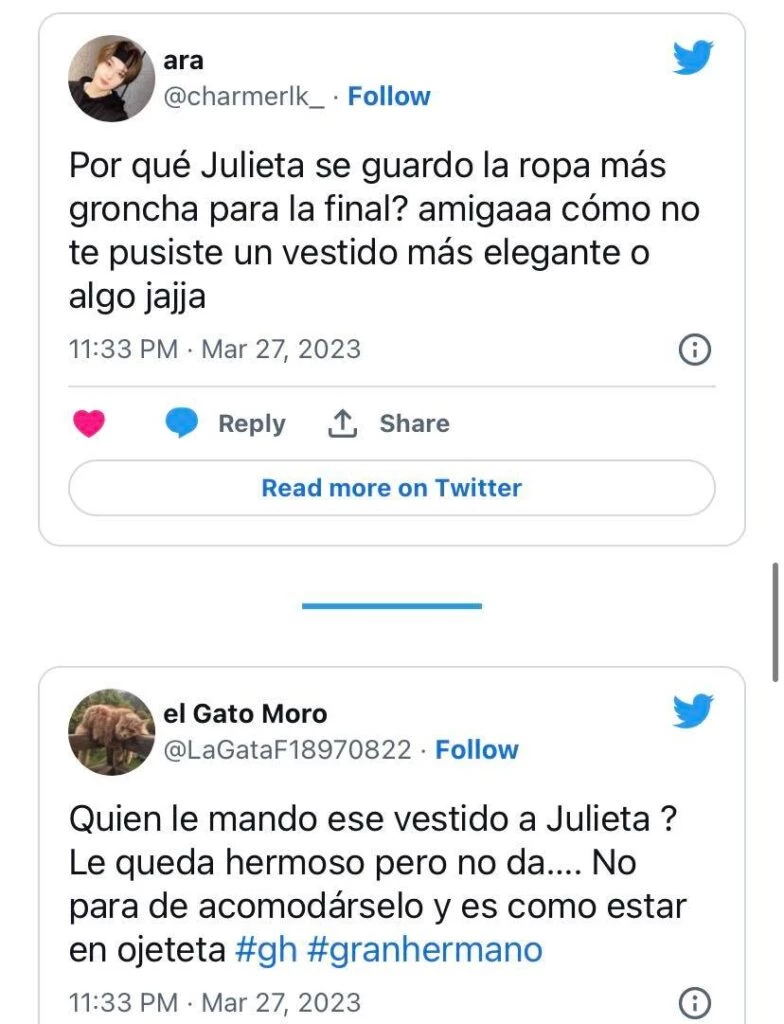 ¿Por qué Julieta se guardó la ropa más groncha para la final?", "Ay Dios Julieta que VALOR para andar asi con ese vestido (gronchisimo) mis respetos", "Como le van a dar ese vestido a Julieta en una final, se sentía súper incomoda", "El enemigo los vistió, al igual que Julieta se la veía super incomoda con el vestido ese", fueron algunos de los tuits.
