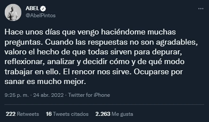 Recientemente Abel preocupó a sus fanáticos por un tuit: “Hace unos días que vengo haciéndome muchas preguntas. Cuando las respuestas no son agradables, valoro el hecho de que todas sirven para depurar, reflexionar, analizar y decidir cómo y de qué modo trabajar en ello. El rencor nos sirve. Ocuparse por sanar es mucho mejor”.