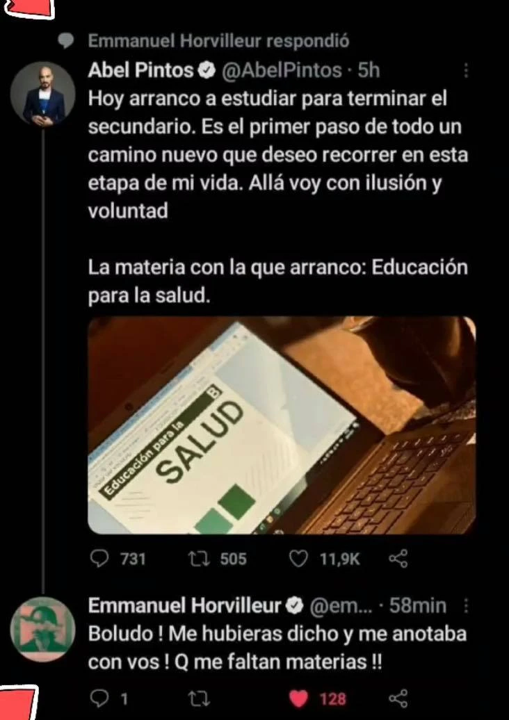 “Hoy arranco a estudiar para terminar el secundario. Es el primer paso de todo un camino nuevo que deseo recorrer en esta etapa de mi vida. Allá voy, con ilusión y voluntad”, fue lo primero que escribió el Abel el domingo en su cuenta de Twitter. Sin dudas, no tardaron en llegar los comentarios de sus fans... e incluso el de su colega Emmanuel Hourviller.