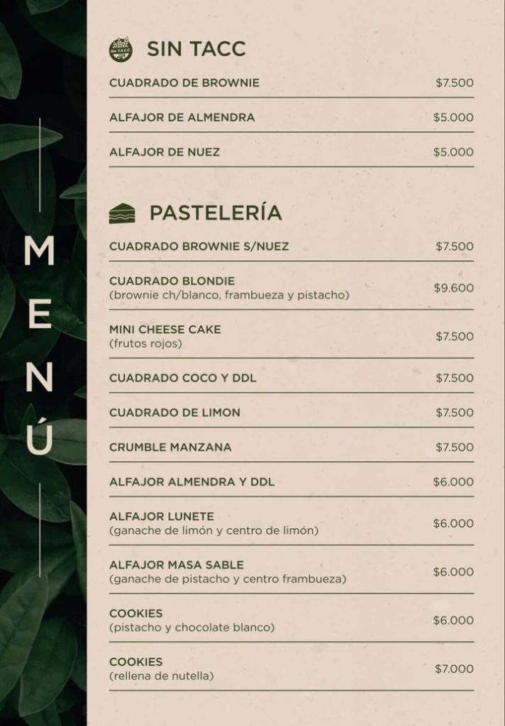 La carta también incluye bebidas frías, licuados, milkshakes, limonadas, pomeladas y exprimidos, con valores que van desde los $5000 hasta los $7500. En cuanto a la pastelería, la propuesta es amplia y variada: cookies, brownies, cuadrados dulces, alfajores artesanales y mini cheesecakes, con precios que oscilan entre los $6000 y $9600. Además, hay opciones sin TACC para quienes tienen restricciones alimentarias.
