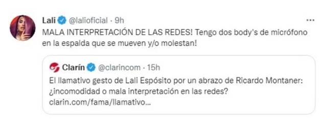 "El llamativo gesto de Lali Espósito por un abrazo de Ricardo Montaner: ¿incomodidad o mala interpretación en las redes?", fue el título. Y ella respondió: "¡Mala interpretación de las redes! ¡Tengo dos body's de micrófono en la espalda que se mueven y/o molestan!". Todo con mayúsculas, demostrando su enojo.