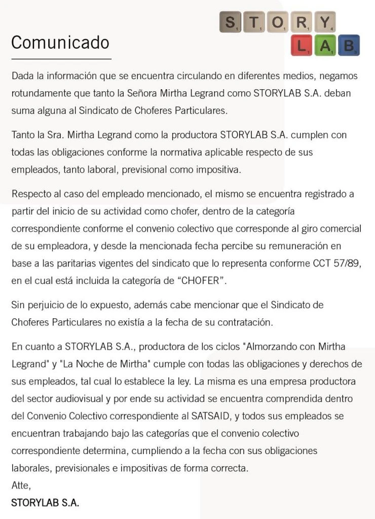 En otro apartado del texto, la productora deja en claro que STORYLAB S.A, empresa productora de los programas "Almorzando con Mirtha Legrand" y "La Noche de Mirtha", no tienen deudas ni asuntos legales pendientes con los trabajadores de la empresa.