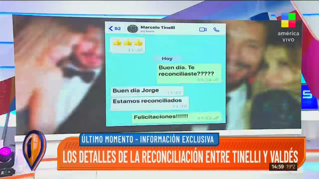 En Intrusos, Jorge Rial mostró el chat que mantuvo con Tinelli donde le confirmó la reconciliación: “Buen día, Marcelo. ¿Te reconciliaste?”. “Buen día Jorge, estamos reconcilados”.