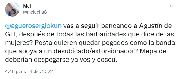 El video con la charla y confesión de Agustín se viralizó rápidamente en Twitter y causó el repudio de cientos de mujeres: "Agustín acaba de decir que tiene en drive una carpeta con todas las nudes que le mandaron las chicas para usarlas por si ellas se mandan alguna. ¿Así o más nefasto? Lo tendrían que denunciar”, expresó una usuaria de la red.