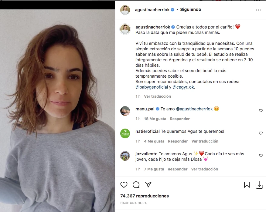 "Me lo han preguntado mucho y decidí explicarlo. Es mi cuarto bebé y tengo 39 años, entonces estaba un poco asustada...", comenzó Agustina, súper sincera, en sus redes sociales.