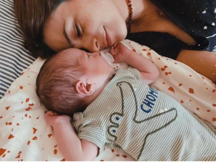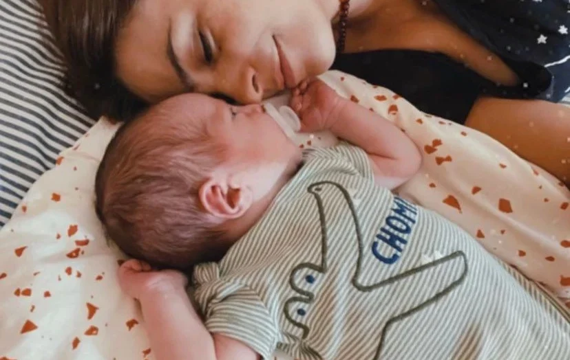 Ya con el alta médica tanto para ella como para su hijo, ambos abandonaron la clínica y finalmente se fueron a su casa. Y fue desde allí que la actriz plasmó en su perfil de instagram una tierna fotografía del niño recostado junto a ella y comenzando a familiarizarse con el hogar y los distintos integrantes de la familia.