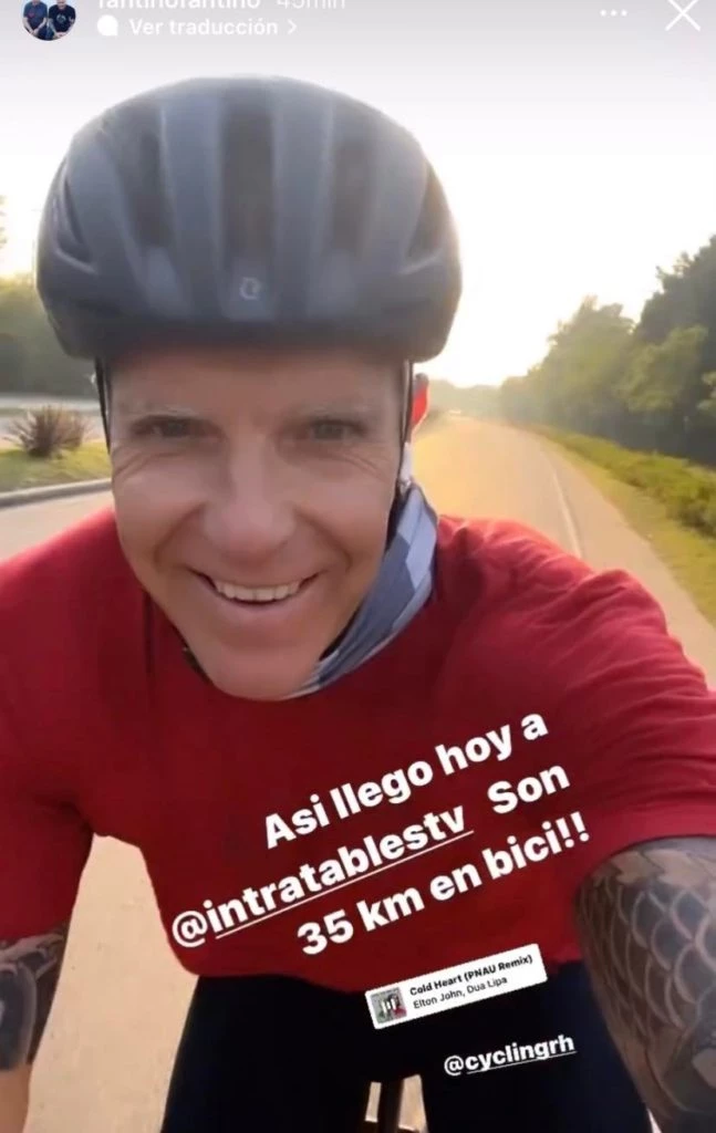 “Así llego hoy a Intratables. Son 35 kilómetros en bici”, escribió Fantino junto al video que publicó en sus historias y donde se lo ve equipado, con casco y calzas, andando en bicicleta. Por esa misma vía, media hora más tarde el periodista compartió imágenes de su ciclocomputador que marcaba la distancia, velocidad y tiempo.