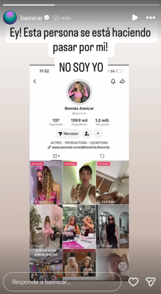 Lejos de quedarse en silencio, Brenda Asnicar decidió actuar rápidamente. En su mensaje, pidió a sus seguidores que reportaran el perfil para evitar que más personas fueran engañadas. La respuesta fue inmediata y, en pocas horas, el tema se volvió tendencia entre sus fans, que salieron a respaldarla.