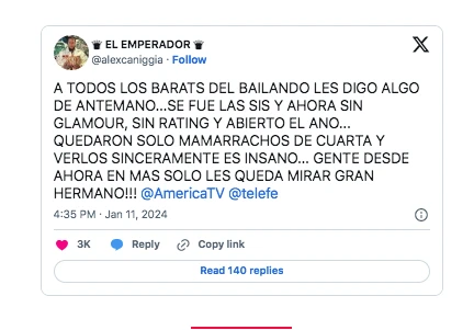 En la continuidad de su mensaje soez, lleno de términos vulgares e hirientes, el mediático añadió: “Quedaron solo mamarrachos de cuarta y verlos sinceramente es insano. ¡Gente, desde ahora en más solo les queda mirar Gran Hermano!".
