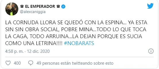 “La cornuda llora, se quedó con la espina; ya está sin obra social, pobre mina. Todo lo que toca lo cag... todo arruina. La dejan porque es sucia como una letrina. #NoBarats”, expresó