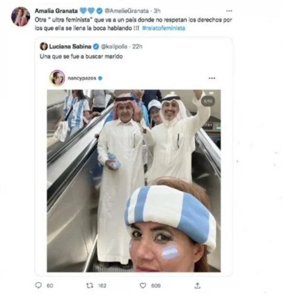 De esta manera, la diputada provincial compartió en Twitter una foto de Nancy luciendo los colores de su bandera mientras sonreía junto a dos varones qataríes y la fulminó: “¡Otra 'ultra feminista' que va a un país donde no respetan los derechos por los que ella se llena la boca hablando! #relatofeminista".