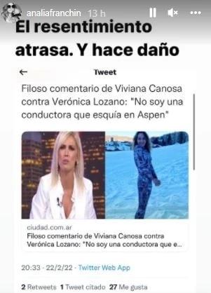 "El resentimiento atrasa y hace daño", escribió Franchín junto al screen de la nota donde se la ve a Viviana Canosa y Verónica Lozano. Mientras tanto ninguna de las famosas salió a responder la publicación que subió Analía en su cuenta de Instagram.