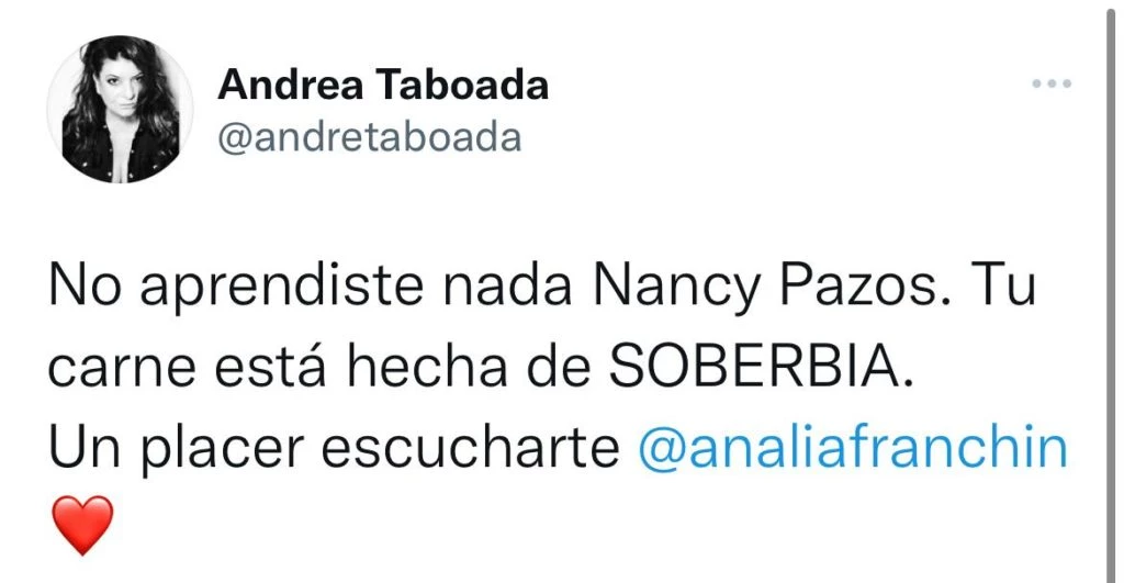 Entre un ida vuelta en vivo todos quedaron atentos para ver cómo avanza el enfrentamiento. Sin embargo, algunos famosos decidieron meterse como Andrea Taboada quien no dudó en apoyar a Franchín y destrozar a Pazos en Twitter cuando escribió: "No aprendiste nada Nancy Pazos. Tu carne está hecha de SOBERBIA. Un placer escucharte