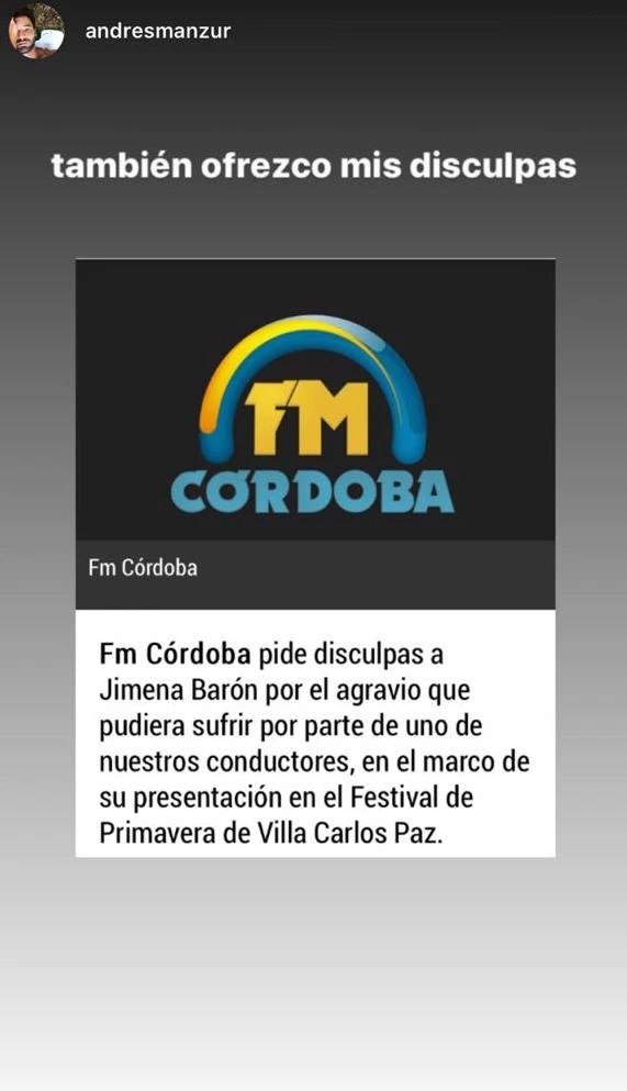 Sin embargo, se esperaba un pedido de disculpas del parte del cordobés, que llegó hace pocas horas y de una manera bastante particular. FM Córdoba publicó: “Pedimos disculpas a Jimena Barón por el agravio que pudiera sufrir por parte de uno de nuestros conductores, en el marco de su presentación en el Festival de Primavera de Villa Carlos Paz”.