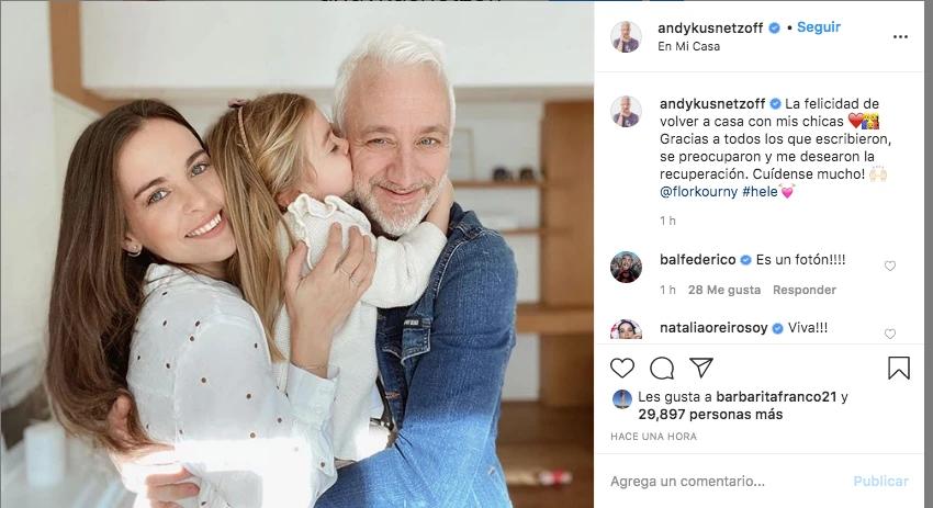 A la imagen muy conmovedora, Andy le agregó un texto: “La felicidad de volver a casa con mis chicas. Gracias a todos los que escribieron, se preocuparon y me desearon la recuperación. Cuídense mucho”.