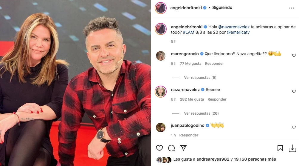 "Hola @nazavelez te animás a opinar de todo? #lam 8/3 a las 20 por @americatv", le preguntó De Brito a su nueva incorporación, compartiendo una foto juntos de cuando Naza hizo un reemplazo en el programa que estuvo durante seis años al aire del canal del "solcito". "Me animo a opinar de todo", le respondió Vélez.