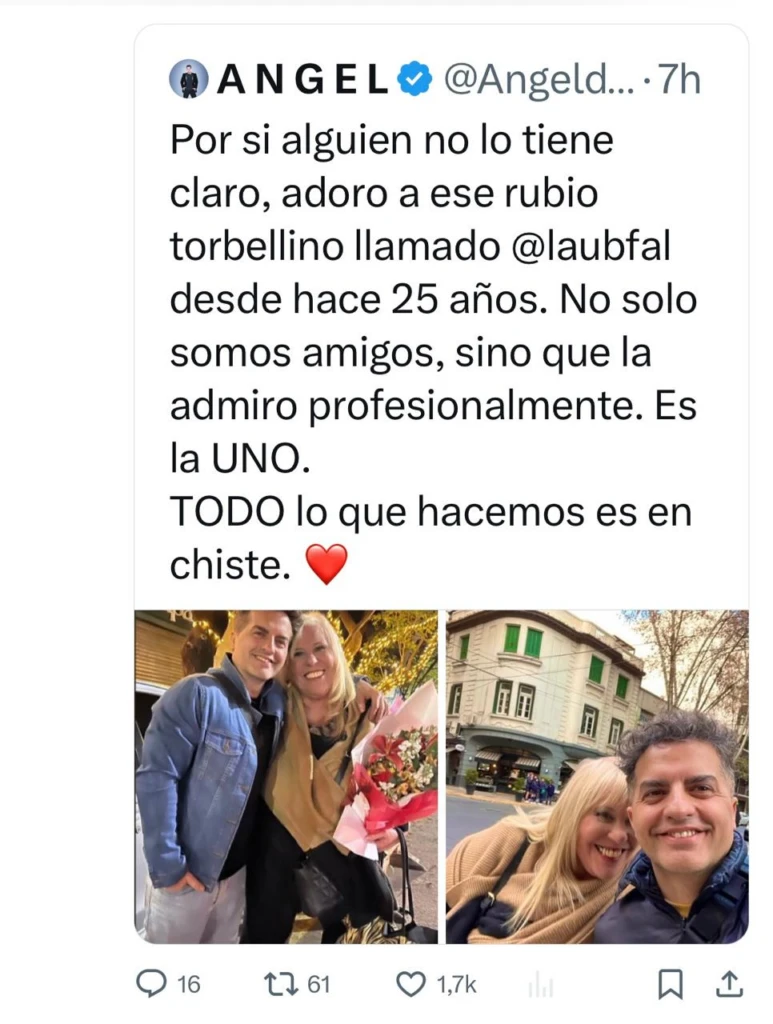 “Por si alguien no lo tiene claro, adoro a ese rubio torbellino llamado Laura Ubfal desde hace 25 años. No solo somos amigos, sino que la admiro profesionalmente”, comenzó explicando de Brito a través de su cuenta de X.