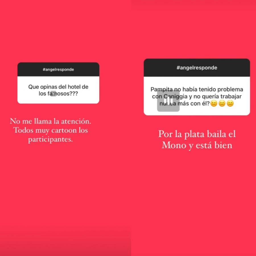 La principal novedad de la televisión local es el hotel de los famosos y Ángel de Brito no ignoró este fenómeno. Producto de ello, en sus redes sociales, el ángel de la información volvió a hacer uso de su clásico Ángel Responde. En ese segmento, de su cuenta de Instagram, el conductor de LAM hizo una referencia al encuentro entre Pampita y Alex Caniggia en el certamen después del fuerte cruce que tuvieron en el Bailando por un sueño.