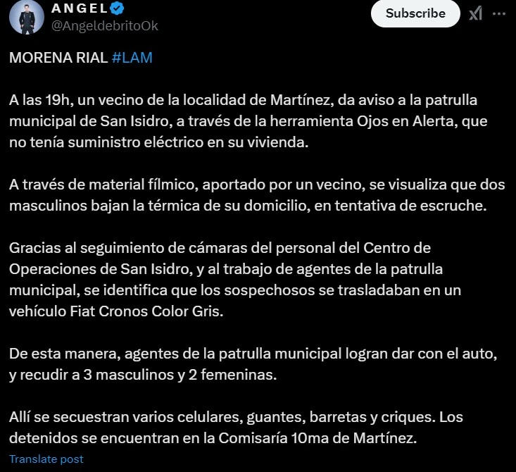 "A las 19h, un vecino de la localidad de Martínez, da aviso a la patrulla municipal de San Isidro, a través de la herramienta Ojos en Alerta, que no tenía suministro eléctrico en su vivienda", comenzó a detallar, Angel De Brito, desde su cuenta, en la red social X.