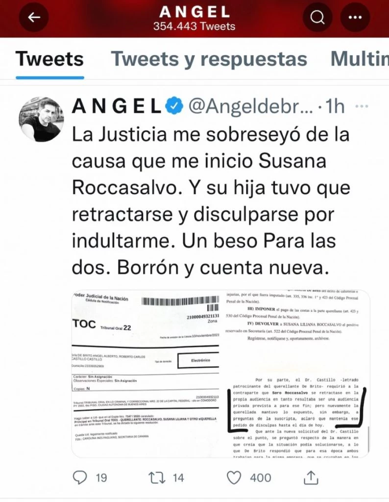 Para finalizar aseguró: "También Susana debe pagar los gastos de abogados y otras cosas que tuve que gastar yo para afrontar esta demanda. No me interesa seguir dándole entidad al tema así que borrón y cuenta nueva". Finalmente tweeteó el falló donde destaca su sobreseimiento.