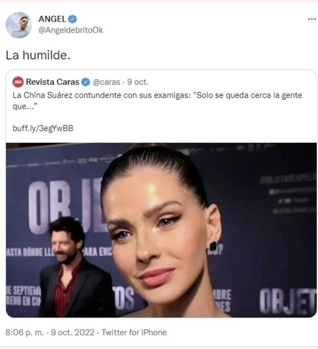 Y Angel no dejó pasar la oportunidad y sobre los dichos de la cantante publicó una ácida devolución en sus redes sociales. En su cuenta oficial de Twitter, el periodista posteó una imagen de la China en un evento y le dedicó dos palabras acompañadas por un signo de puntuación, el punto final, ni más ni menos. "La humilde".
