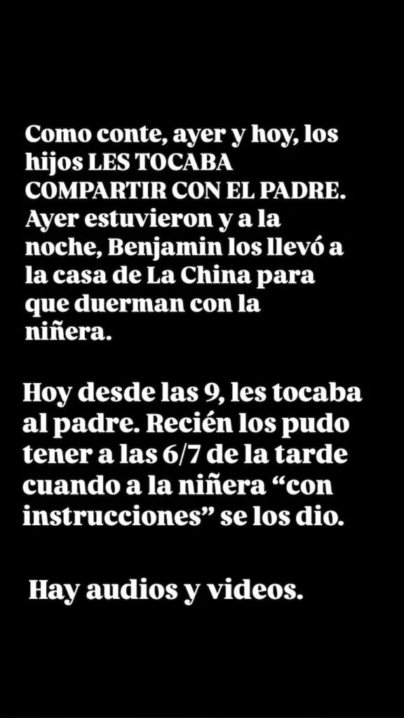“Como conté ayer y hoy, a los hijos les tocaba compartir con el padre. Ayer estuvieron y a la noche, Benjamín los llevó a la casa de la China para que duerman con la niñera. Hoy, desde las 9 am, le toca al padre. Recién los pudo tener a las 6/7 de la tarde cuando la niñera ‘con instrucciones’ se los dio. Hay audios y videos”, amplió Ángel.