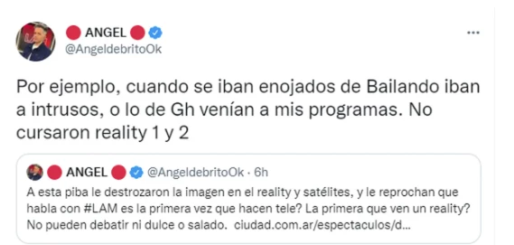 Como si fuese poco, Ángel tiró más combustible al fuego y publicó: "Por ejemplo, cuando se iban enojados de Bailando iban a Intrusos, o los de GH venían a mis programas. No cursaron reality 1 y 2”.