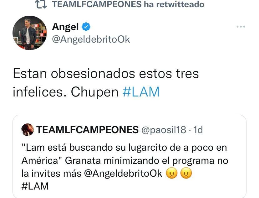 "Están obsesionados conmigo estos tres infelices. Chupen #LAM", escribió Angel en twitter furioso por los ataques del staff de Polino Auténtico.