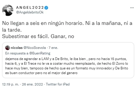 Aunque fue un exitoso proyecto, que estuvo varios años al aire, muchos no piensan lo mismo. Un usuario de Twitter expuso su opinión en la red social y generó el enojo de Ángel. "Dejemos de agrandar a LAM y a De Brito, le iba bien pero no hacia 15 puntos, hacia 6. El Trece no le va a costar mucho reemplazarlo, de hecho El Zorro lo hace muy bien", escribió.