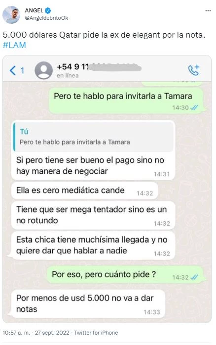 “5 mil dólares Qatar pide la ex de Elegant por la nota”, contó Ángel en Twitter, donde compartió la captura del chat que una de las productoras del programa mantuvo con quien se encarga de manejarle la agenda a la influencer que cotiza alto.