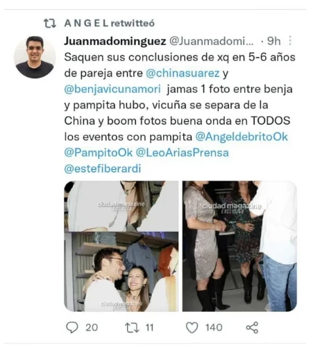Como en el caso de Ángel de Brito, quien posó su mirada filosa en las postales sonrientes de Pampita y Benjamín. Resulta que el conductor de LAM retuiteó un mensaje que reza: "Saquen sus conclusiones de por qué en 5, 6 años de pareja entre China y Benjamín jamás hubo una foto entre Benja y Pampita. Vicuña se separa de China y boom, fotos buena onda en todos los eventos con Pampita".