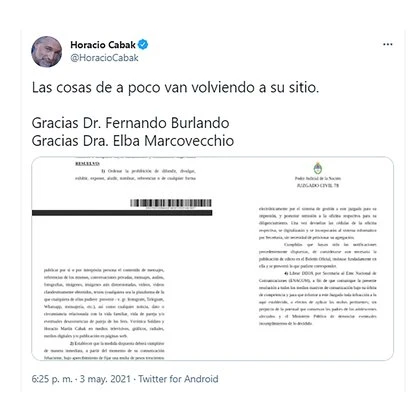 En Los ángeles de la mañana, por El Trece, Ángel arremetió contra su colega después de conocerse, a través del Twitter de Cabak, que puso una medida cautelar para que los medios no hablen más del escándalo tras su separación.