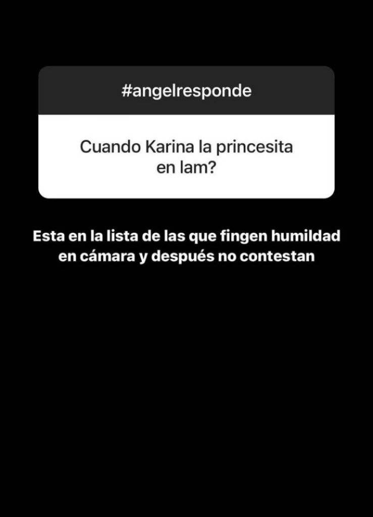 “¿Cuándo Karina la Princesita en LAM?", le envió un seguidor anónimo. Asumiendo la consulta que le hicieron, Ángel en muy pocas palabras resumió lo que pasa y ubicó a Karina en la mira de un nuevo conflicto con el periodista.