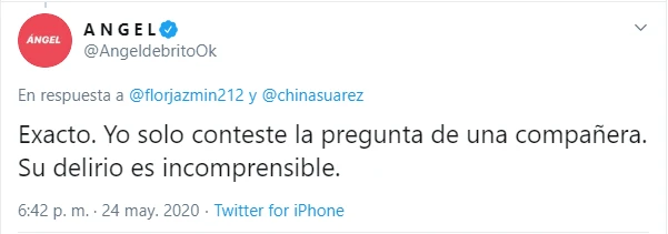 "No la sigo. Ni le pedí opinión. Beso", escribió De Brito. "Yo solo contesté la pregunta de una compañera. Su delirio es incomprensible", agregó.