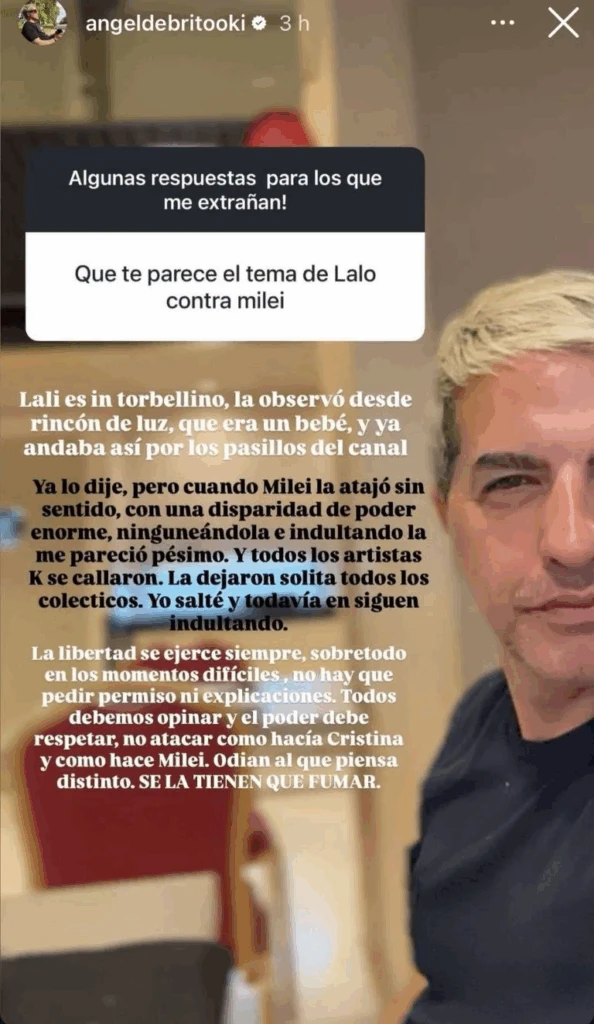 Con estas palabras, De Brito no solo defendió a Lali de los cuestionamientos, sino que también señaló la falta de apoyo de sus colegas del medio artístico en un momento de tensión. Según él, la cantante fue “dejada sola” frente al poder político y mediático.