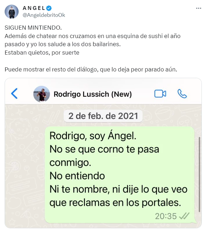 “Siguen mintiendo. Además de chatear nos cruzamos en una esquina de sushi el año pasado y yo los saludé a los dos bailarines. Estaban quietos, por suerte", disparó Ángel, y agregó: "Puede mostrar el resto del diálogo, que lo deja peor parado aún".