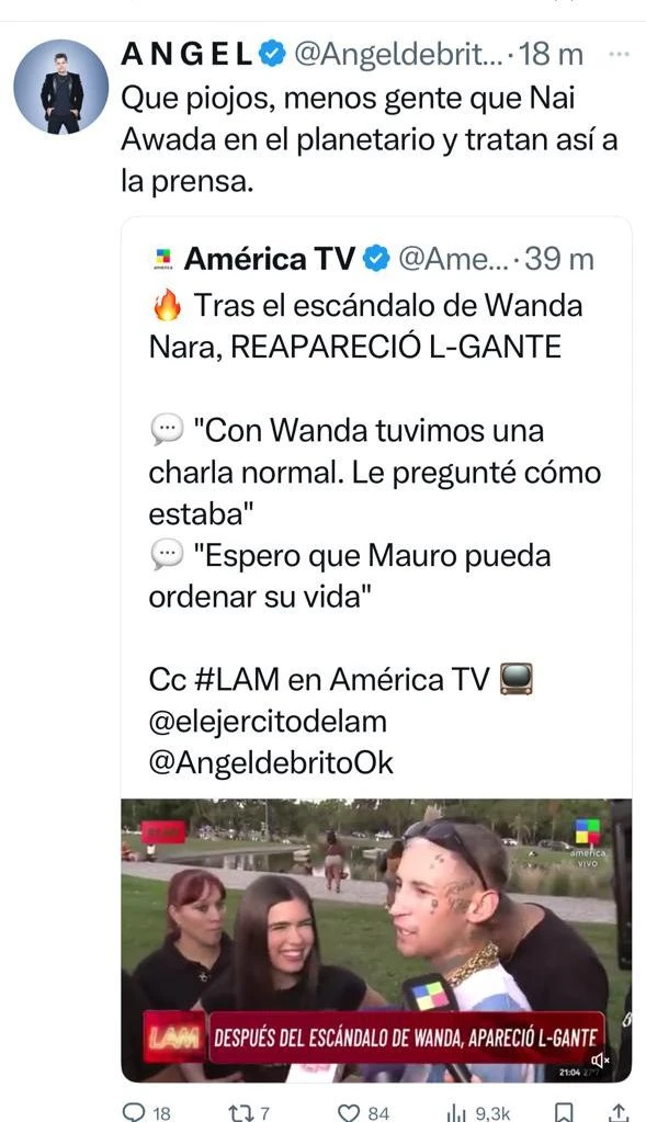 Lejos de quedar ahí su descargo, antes de que su panel salga a criticar al músico, Angel sumó: “A Wanda ya está, la limpió. Pero dale, parate y hablá bien. Si a los medios siempre habla bien L-Gante. Había más cronistas que gente. Cinco micrófonos y diez personas”.