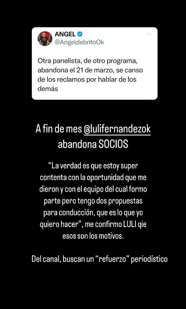 A través de un posteo, De Brito- quien le declaró la guerra a Sole Aquino- anunció que "otra panelista, de otro programa, abandona el 21 de marzo. Se cansó de los reclamos por hablar de más. A fin de mes Luli abandona Socios", contó Angel, en su red social. Y también reprodujo la confirmación de Fernández sobre su partida del ciclo de tevé.