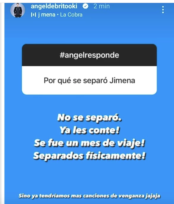 Empero, a las horas, el propio Ángel regresó al mundo digital para arrojar más claridad al asunto. Nuevamente el conductor utilizó sus stories para aportar una actualización de la trama y mostró la duda que le trasladó uno de sus followers: “¿Por qué se separó Jimena Barón?”.