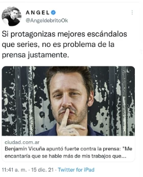 Fue en su cuenta de Twitter donde el periodista expuso su pensamiento sobre Benjamín, sin vueltas ni rodeos. Desde la tranquilidad que imponen las playas, Angel le dedicó unas líneas en el mundo virtual a Vicuña. “Si protagonizás mejores escándalos que series, no es problema de la prensa justamente”, le respondió De Brito, que revalúa su futuro laboral.
