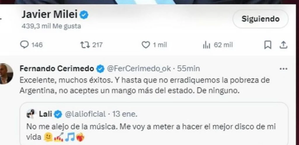 “Recibe lo que tiene que recibir. Nosotros no nos quedamos con el dinero de nadie. Por lo tanto, si tiene un problema en cómo asigna los recursos... Digamos, si gasta plata contratando a Lali Espósito y después no le paga a la policía, no es problema nuestro”, escribió Milei quien luego reposteó un tuit que decía que Lali había cobrado 37.444.000 pesos por una actuación, y acotó: “Qué peligroso, qué triste”.