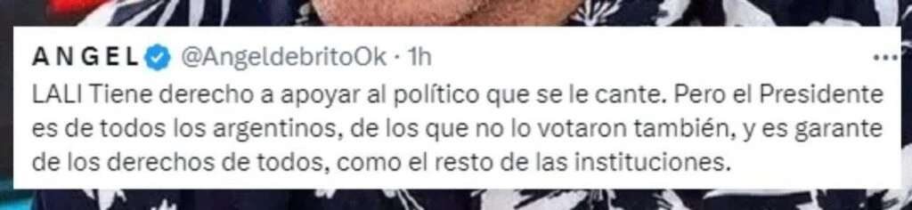 ¿Qué opinión tomó el conductor de LAM? Sin importarle el qué dirán, el periodista de espectáculos manifestó: “Lali tiene derecho a apoyar al político que se le cante. Pero el presidente es de todos los argentinos, de los que no lo votaron también y es garante de los derechos de todos, como el resto de las instituciones”. ¿Le respondrá Milei?